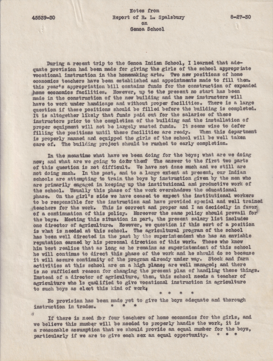 Notes from Report of R. L. Spalsbury, 27 Aug. 1930; Folder: 45539-1930-800, Box 20; Central Classified Files, 1907–1939 (NAID 300324); Office of Indian Affairs; Record Group 75; National Archives and Records Administration-Washington, DC.