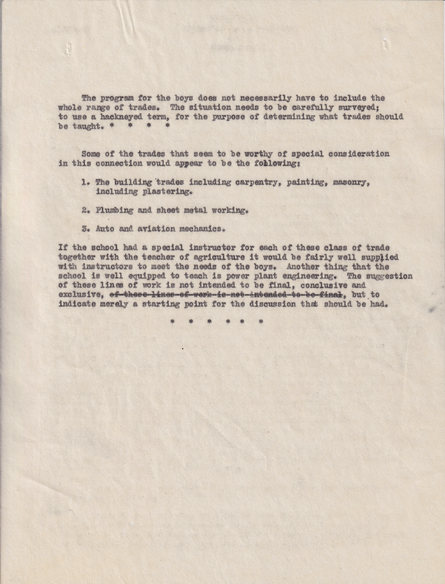 Regarding the additions to girls' home economics and the consideration of adding more trade education for boys including carpentry, painting, masonry, plumbing and sheet metal working, and auto and aviation mechanics.Identifier: