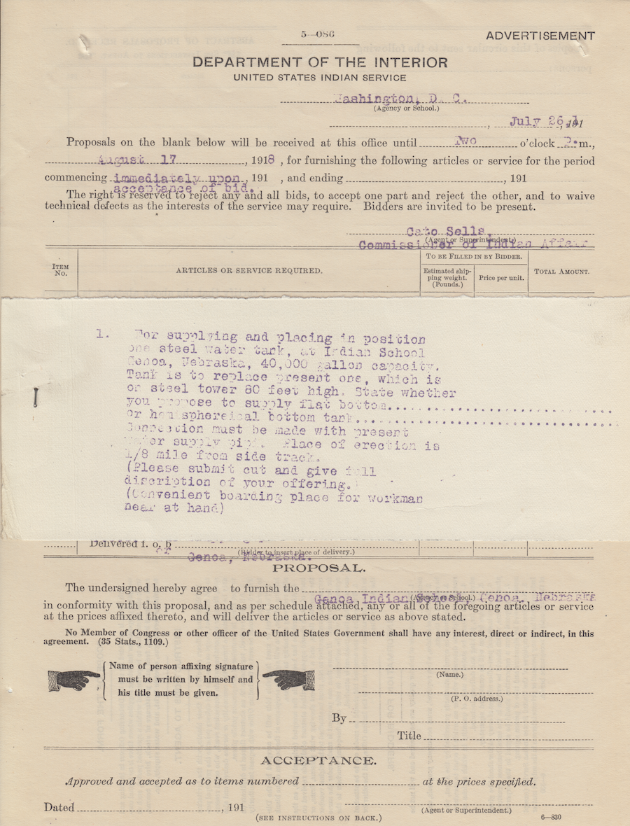 Proposal Form, 26 July 1918; Folder: 83054-1917-424, Box 17; Central Classified Files, 1907–1939 (NAID 300324); Office of Indian Affairs; Record Group 75; National Archives and Records Administration-Washington, DC.