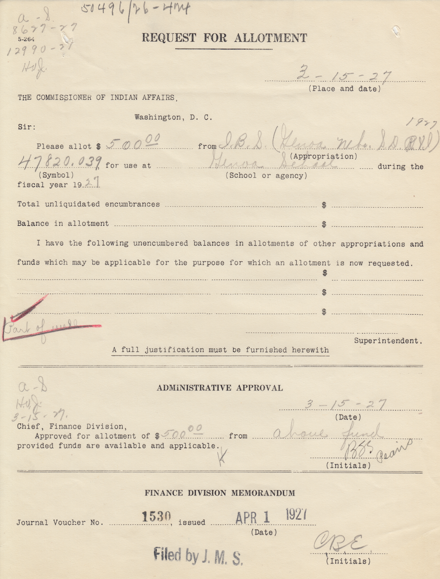 Request for Allotment, 15 Mar. 1927; Folder: 50496-1926-424, Box 17; Central Classified Files, 1907–1939 (NAID 300324); Office of Indian Affairs; Record Group 75; National Archives and Records Administration-Washington, DC.
