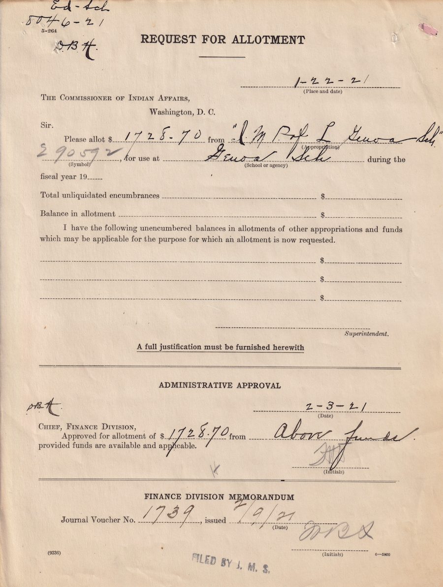 Request for Allotment, 22 Jan. 1921; Folder: 102442-1917-733, Box 19; Central Classified Files, 1907–1939 (NAID 300324); Office of Indian Affairs; Record Group 75; National Archives and Records Administration-Washington, DC.