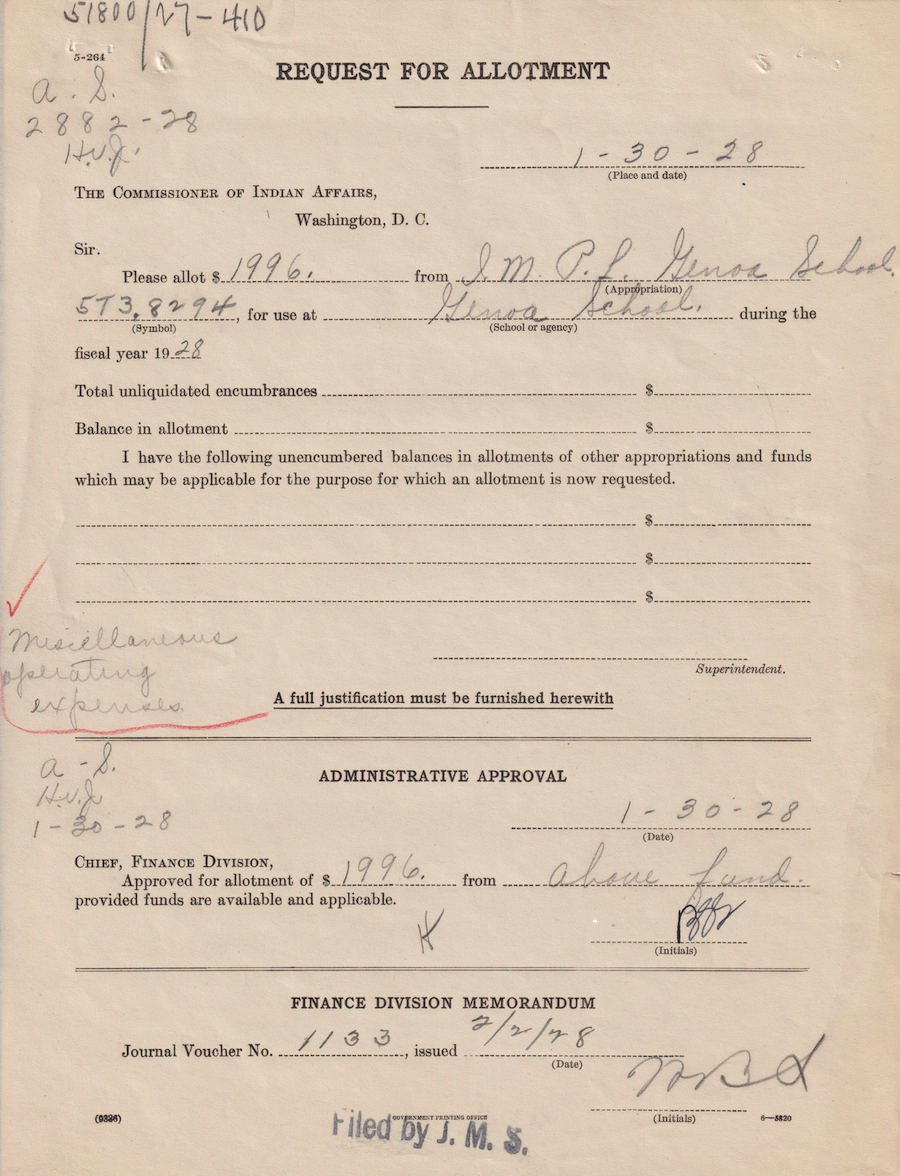 Request for Allotment, 30 Jan. 1928; Folder: 51800-1927-410, Box 17; Central Classified Files, 1907–1939 (NAID 300324); Office of Indian Affairs; Record Group 75; National Archives and Records Administration-Washington, DC.
