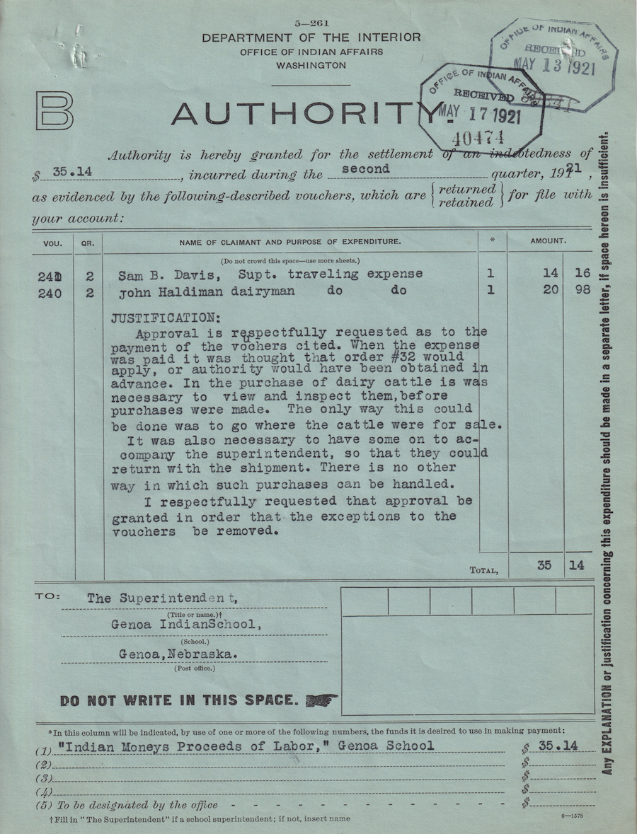 Request for Settlement Form, 17 May 1921; Folder: 102442-1917-733, Box 19; Central Classified Files, 1907–1939 (NAID 300324); Office of Indian Affairs; Record Group 75; National Archives and Records Administration-Washington, DC.