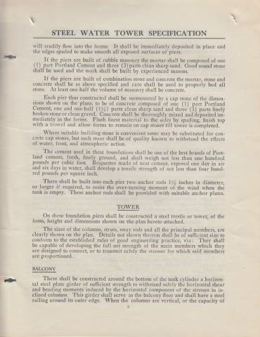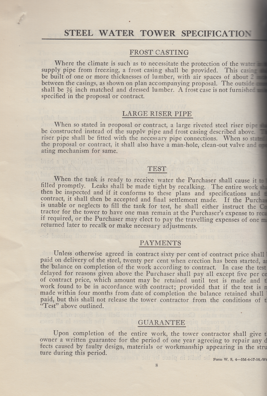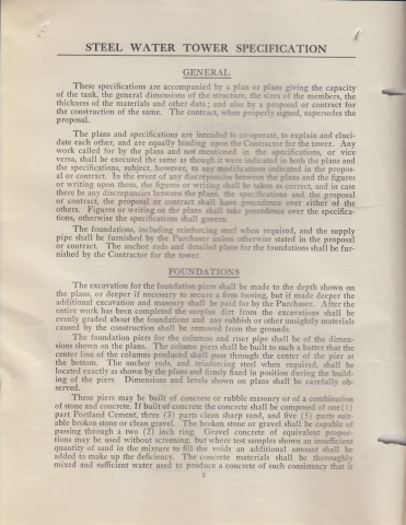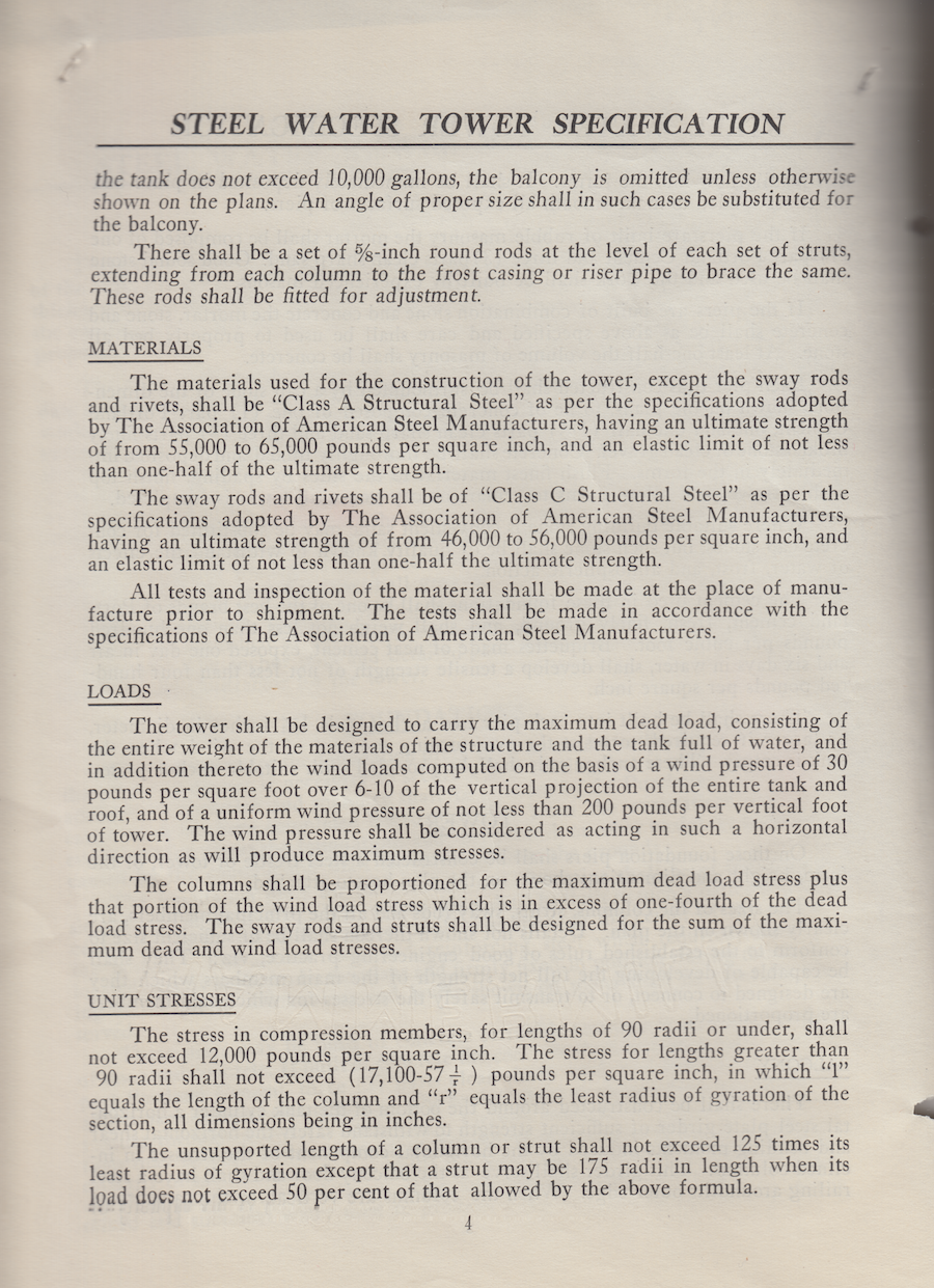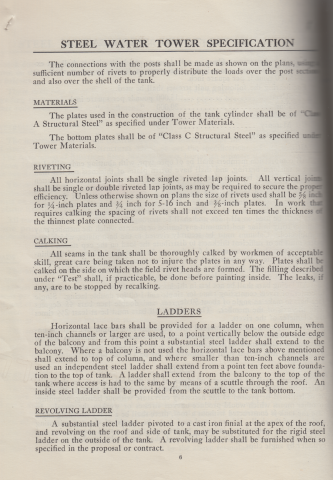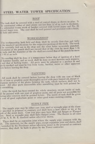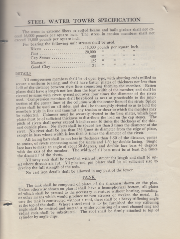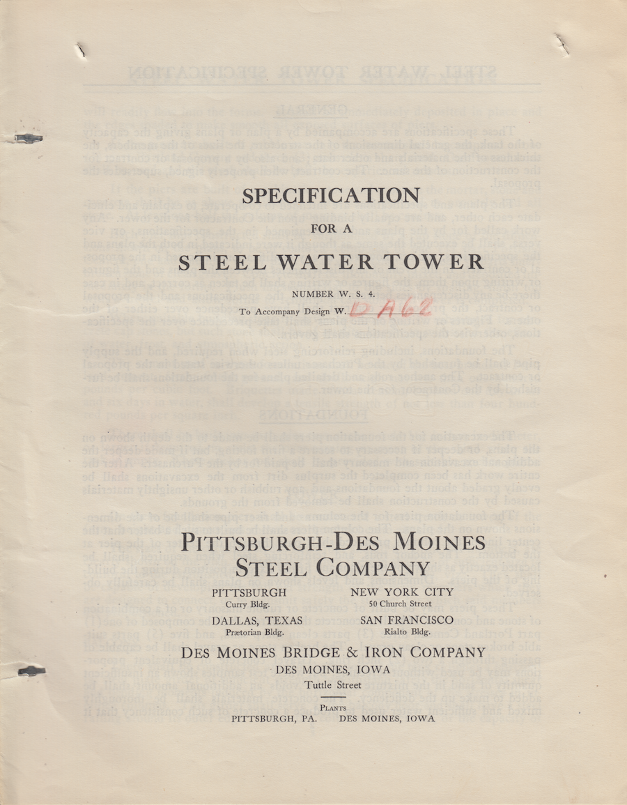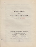 Specification for Steel Water Tower from Pittsburgh-Des Moines Steel Company, 15 Aug. 1918