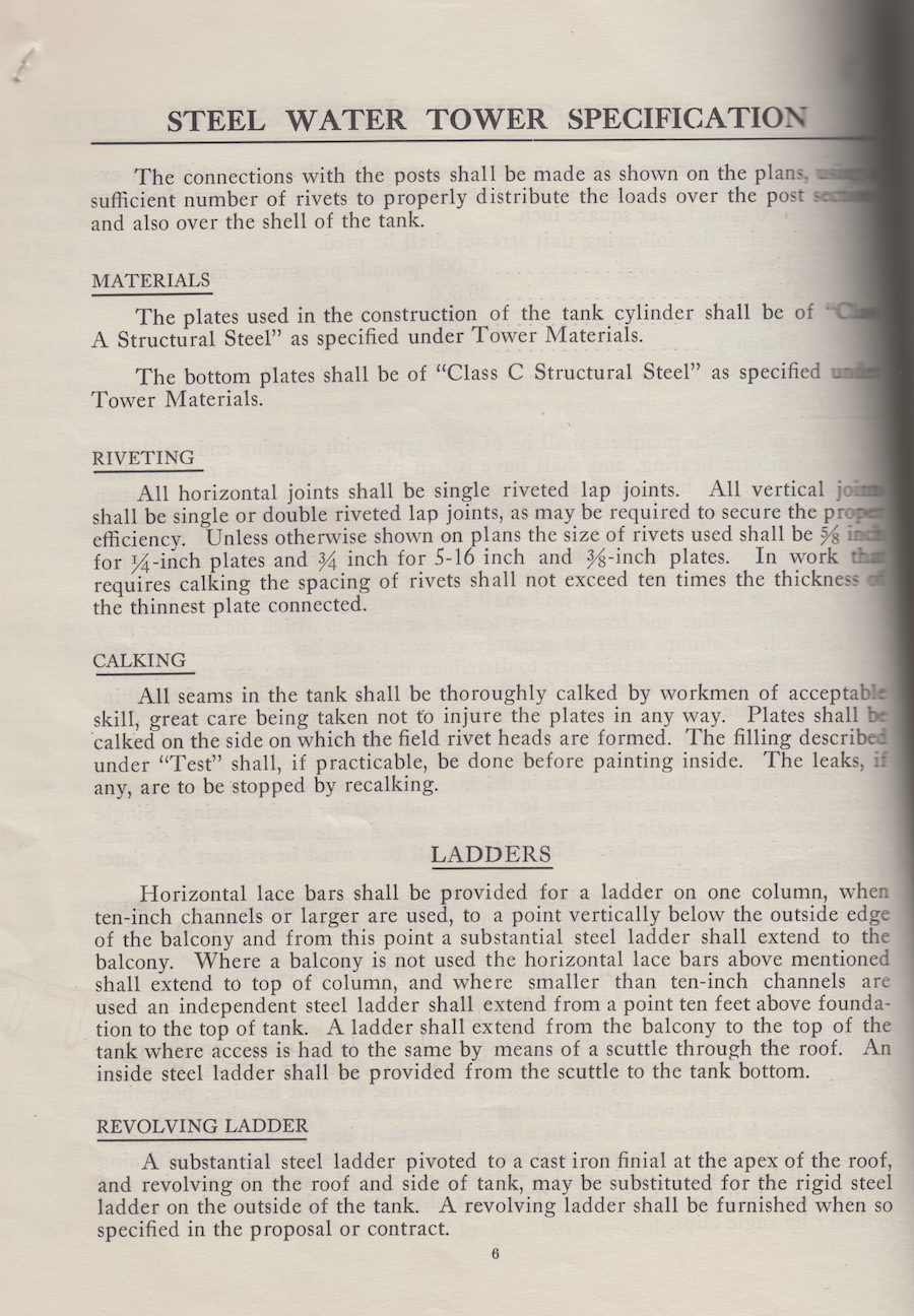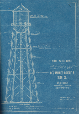 Specification for Steel Water Tower from the Pittsburgh-Des Moines Steel Company, 15 Aug. 1918; Folder: 83054-1917-424, Box 17; Central Classified Files, 1907–1939 (NAID 300324); Office of Indian Affairs; Record Group 75; National Archives and Records Administration-Washington, DC.