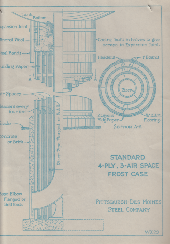 This specifications proposal contains three architectural drawings: one of the water tower, one of standard overflow piping, and one of standard 4-ply, 3-air space frost case.