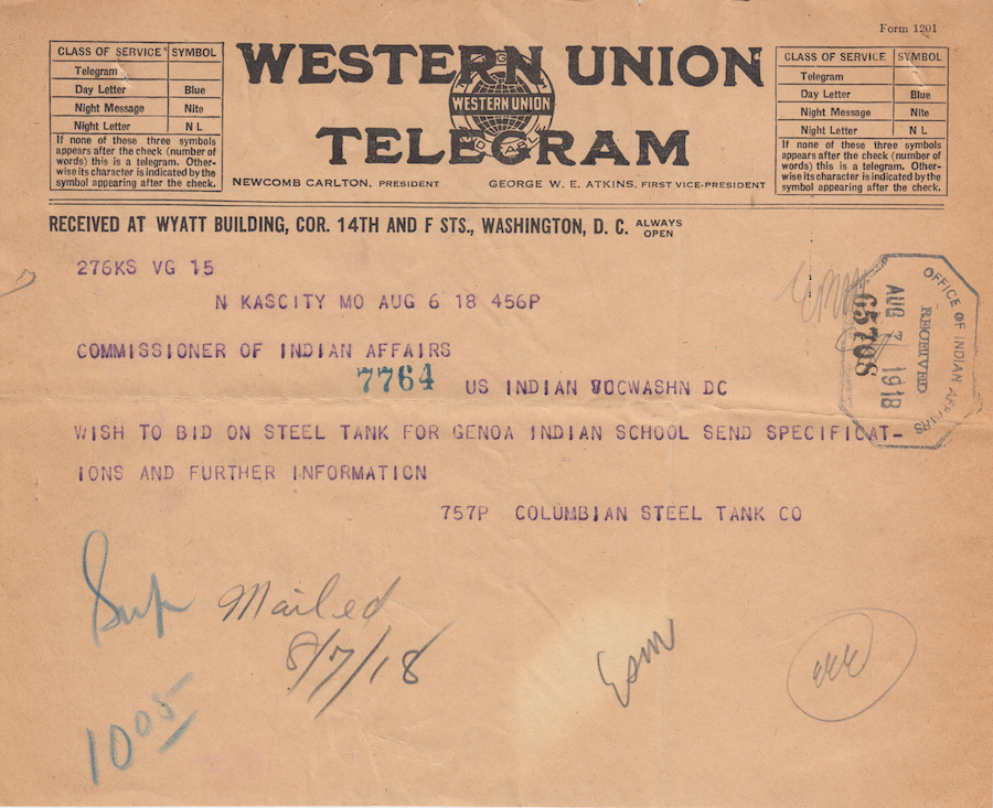Telegram from Columbian Steel Tank Co., 6 Aug. 1918; Folder: 83054-1917-424, Box 17; Central Classified Files, 1907–1939 (NAID 300324); Office of Indian Affairs; Record Group 75; National Archives and Records Administration-Washington, DC.