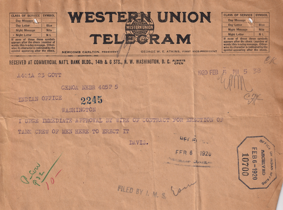Telegram from Davis to the Indian Office; Folder: 83054-1917-424, Box 17; Central Classified Files, 1907–1939 (NAID 300324); Office of Indian Affairs; Record Group 75; National Archives and Records Administration-Washington, DC.