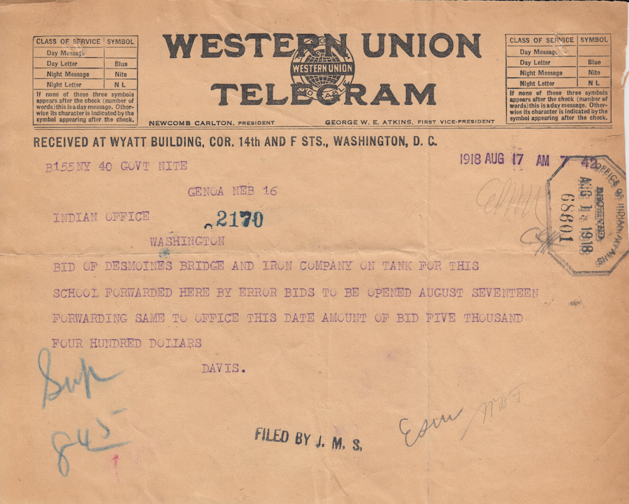 Telegram from Davis to the Indian Office, 17 Aug. 1918; Folder: 83054-1917-424, Box 17; Central Classified Files, 1907–1939 (NAID 300324); Office of Indian Affairs; Record Group 75; National Archives and Records Administration-Washington, DC.