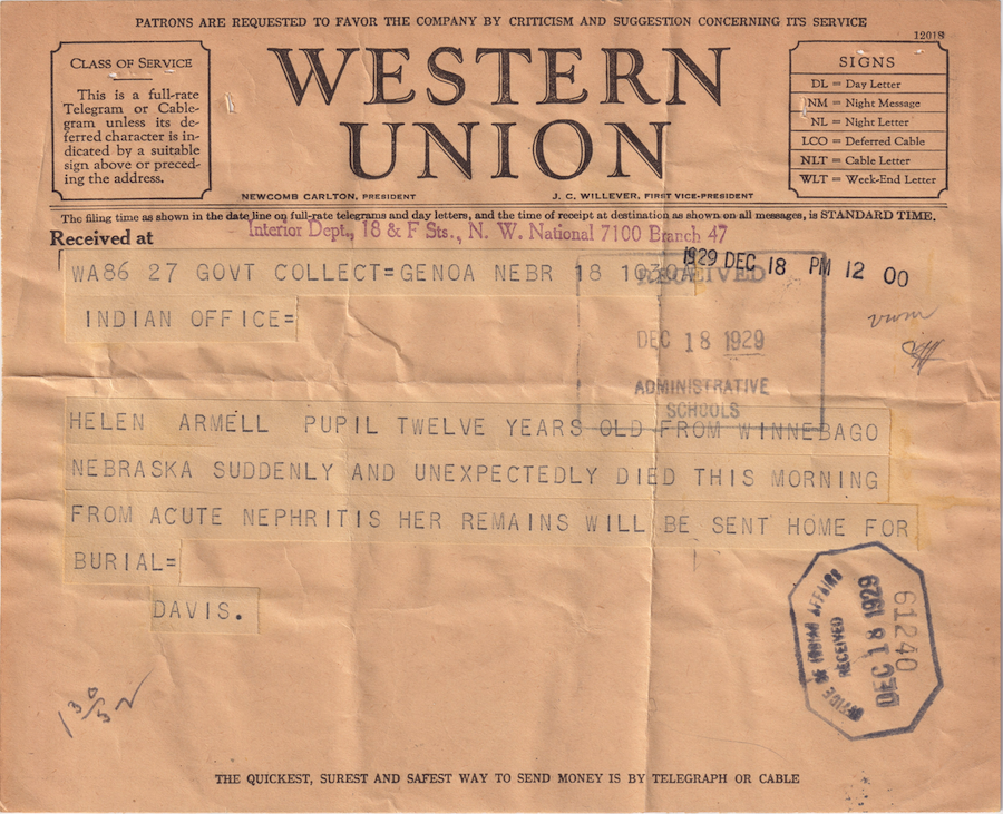 Telegram from Davis to the Indian Office, 18 Dec. 1929; Folder: 61240-1929-736, Box 20; Central Classified Files, 1907–1939 (NAID 300324); Office of Indian Affairs; Record Group 75; National Archives and Records Administration-Washington, DC.