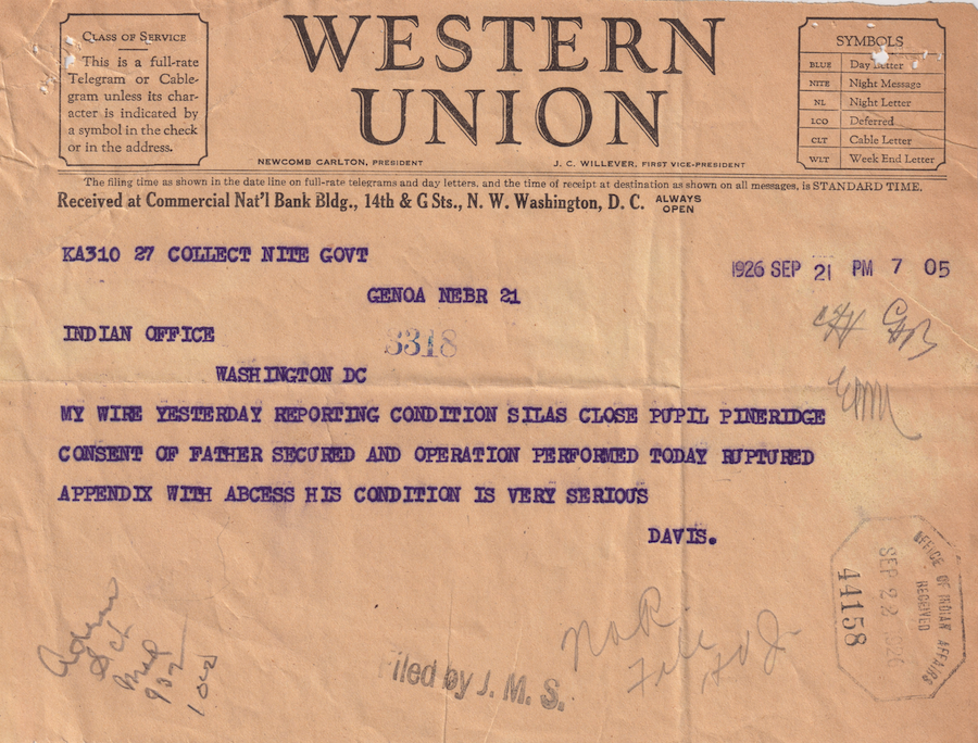 Telegram from Davis to the Indian Office, 20 Sept. 1926; Folder: 43932-1926-732, Box 19; Central Classified Files, 1907–1939 (NAID 300324); Office of Indian Affairs; Record Group 75; National Archives and Records Administration-Washington, DC.