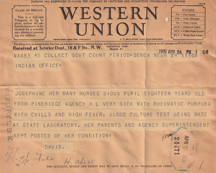 Telegram from Davis to the Indian Office, 24 Apr. 1931; Folder: 24471-1931-732, Box 19; Central Classified Files, 1907–1939 (NAID 300324); Office of Indian Affairs; Record Group 75; National Archives and Records Administration-Washington, DC.