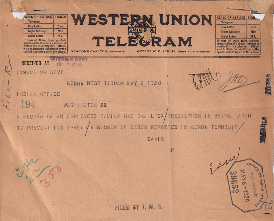 Telegram from Davis to the Indian Office, 8 May 1920; Folder: 39652-1920-731, Box 19; Central Classified Files, 1907–1939 (NAID 300324); Office of Indian Affairs; Record Group 75; National Archives and Records Administration-Washington, DC.