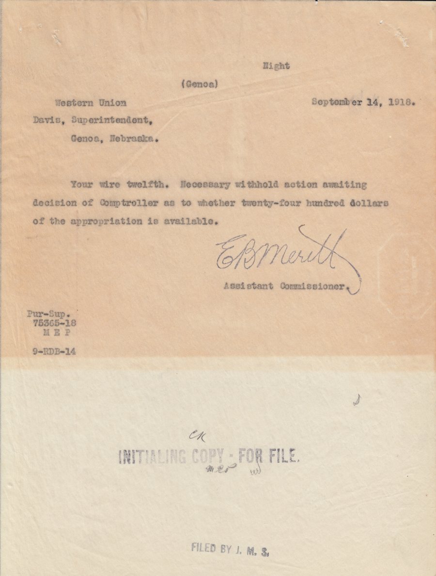 Telegram from E. B. Meritt to Superintendent Davis, 24 Sept. 1918; Folder: 83054-1917-424, Box 17; Central Classified Files, 1907–1939 (NAID 300324); Office of Indian Affairs; Record Group 75; National Archives and Records Administration-Washington, DC.