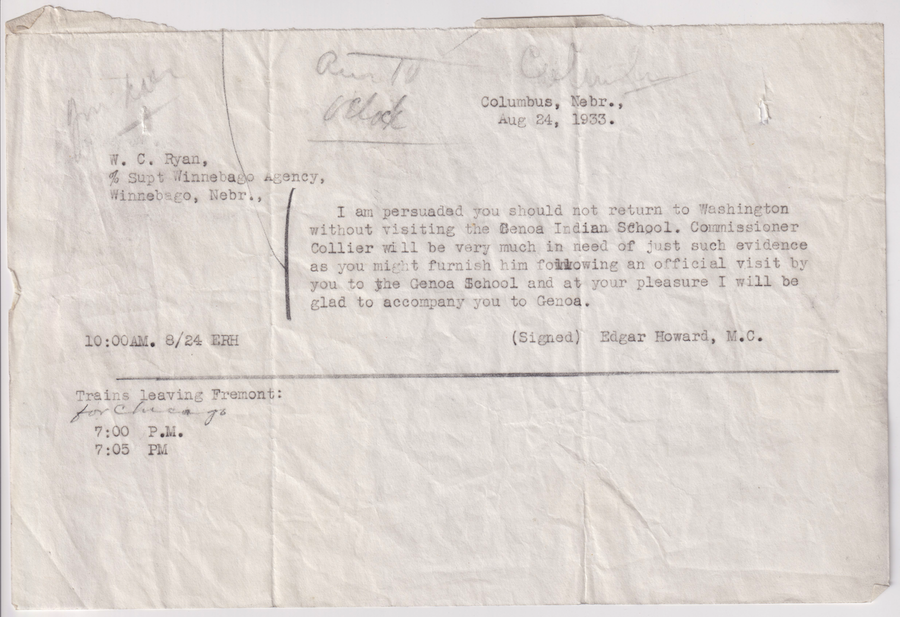 Telegram from Edgar Howard to W. C. Ryan, 24 Aug. 1933; Folder: 45539-1930-800, Box 20; Central Classified Files, 1907–1939 (NAID 300324); Office of Indian Affairs; Record Group 75; National Archives and Records Administration-Washington, DC.
