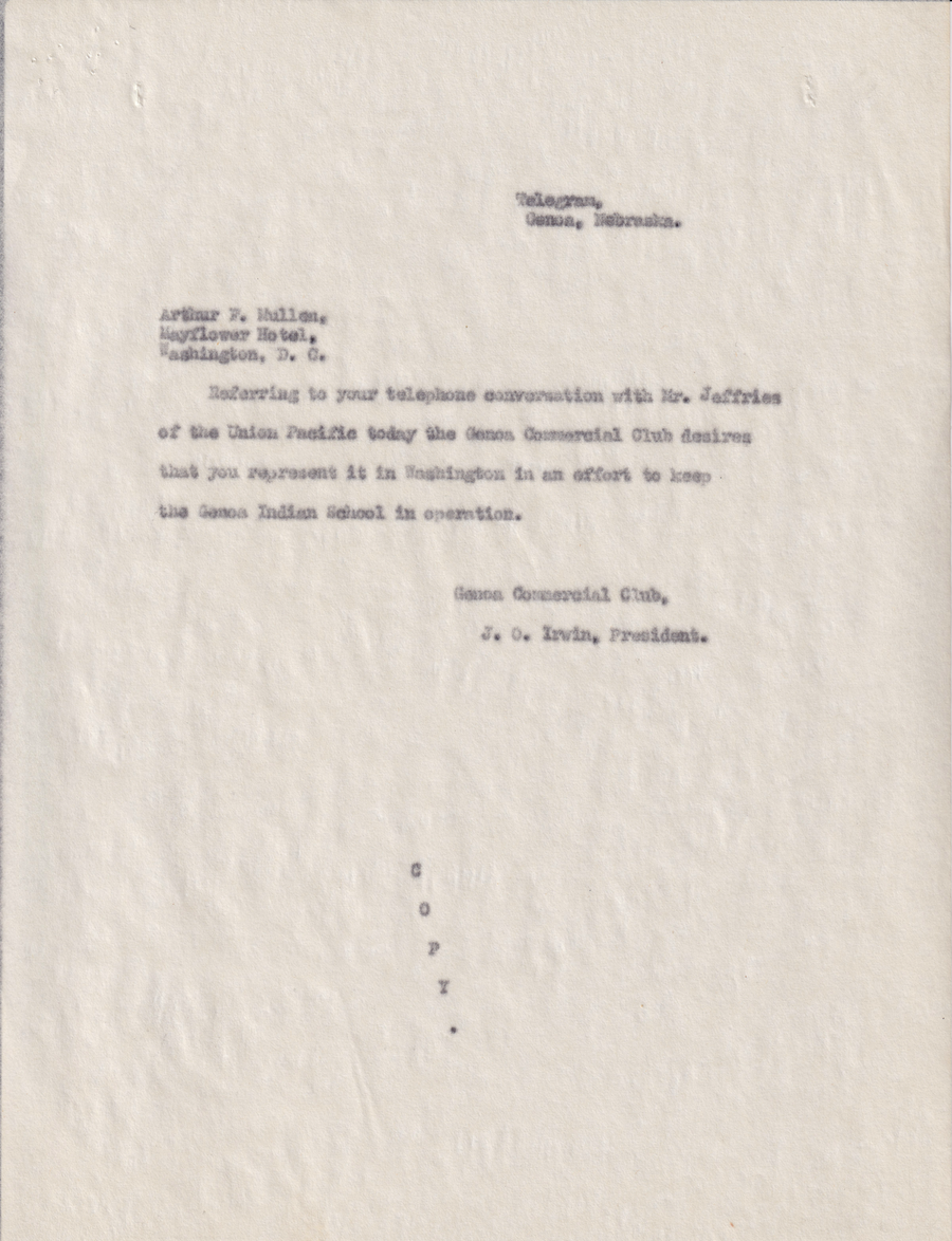 Regarding the request of the Genoa Commercial Club wanting a representative in Washington to keep the school in operation.Identifier: