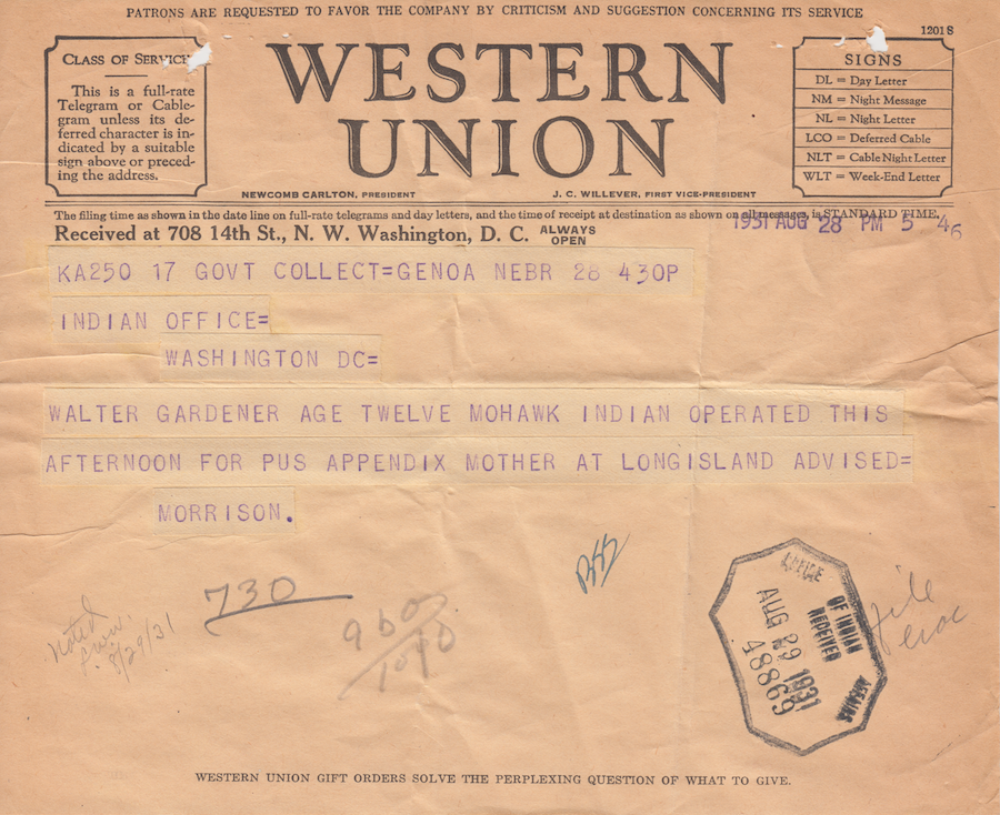 Telegram from Morrison to the Indian Office, 28 Aug. 1931; Folder: 48869-1931-730, Box 19; Central Classified Files, 1907–1939 (NAID 300324); Office of Indian Affairs; Record Group 75; National Archives and Records Administration-Washington, DC.