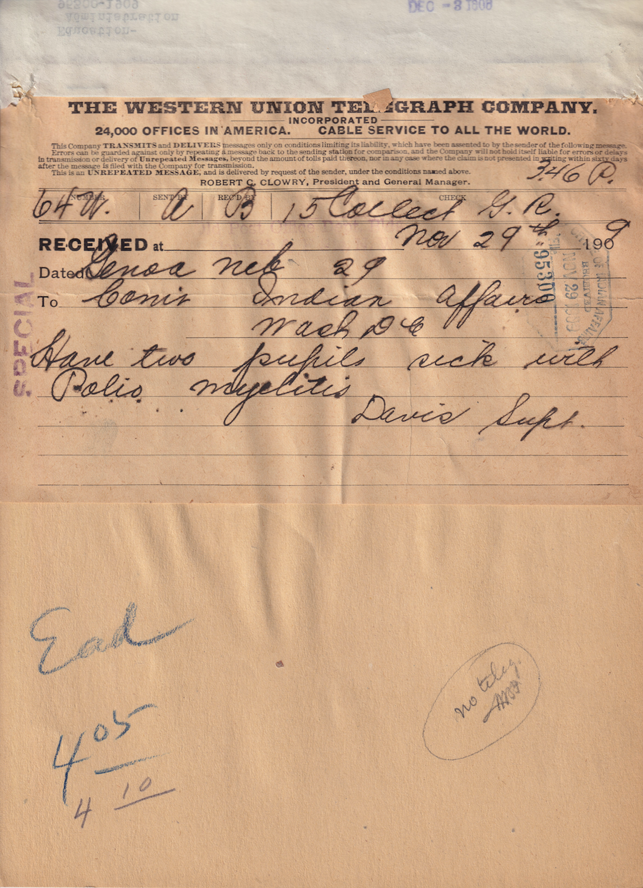 Telegram from Supt. Davis to the Comm. Indian Affairs, 29 Nov. 1909; Folder: 95300-1909-731, Box 19; Central Classified Files, 1907–1939 (NAID 300324); Office of Indian Affairs; Record Group 75; National Archives and Records Administration-Washington, DC.