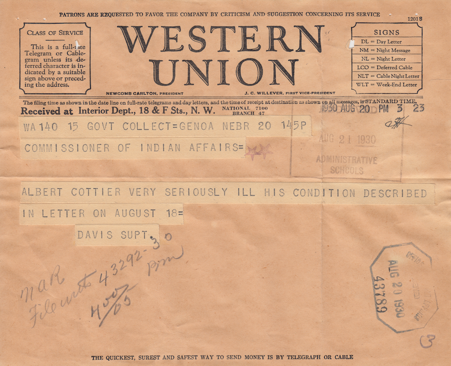 Telegram from Supt. Davis to the Commissioner of Indian Affairs, 21 Aug. 1930; Folder: 43292-1930-730, Box 19; Central Classified Files, 1907–1939 (NAID 300324); Office of Indian Affairs; Record Group 75; National Archives and Records Administration-Washington, DC.