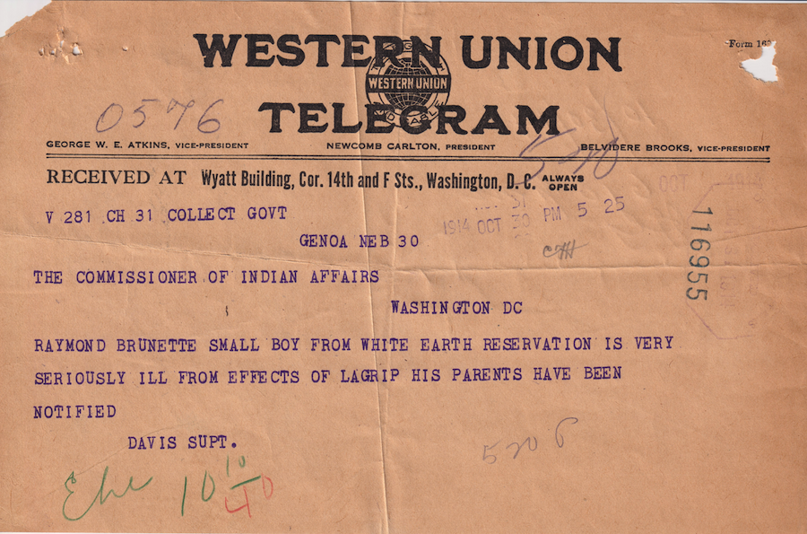 Telegram from Supt. Davis to the Commissioner of Indian Affairs, 30 Oct. 1914; Folder: 116955-1914-732, Box 19; Central Classified Files, 1907–1939 (NAID 300324); Office of Indian Affairs; Record Group 75; National Archives and Records Administration-Washington, DC.