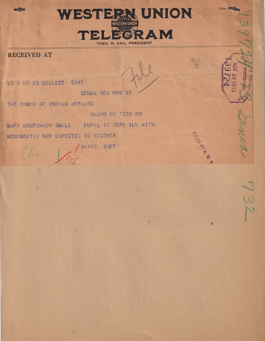 Telegram from Supt. Davis to the Commr. of Indian Affairs, 29 Nov. 1913; Folder: 139724-1913-732, Box 19; Central Classified Files, 1907–1939 (NAID 300324); Office of Indian Affairs; Record Group 75; National Archives and Records Administration-Washington, DC.