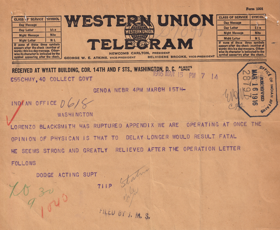 Telegram from Supt. Dodge to Indian Office, 15 Mar. 1916; Folder: 28797-1916-732, Box 19; Central Classified Files, 1907–1939 (NAID 300324); Office of Indian Affairs; Record Group 75; National Archives and Records Administration-Washington, DC.